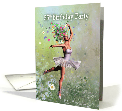 55th birthday party invitation with a ballerina dancing in a meadow. Fowers surround her as she dances. A lovely, happy way to invite your friends and family to a birthday party, A great card for anyone who enjoys dancing, especially ballet.