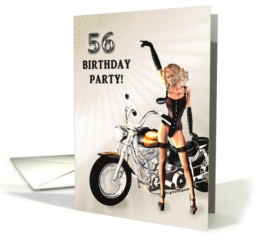 56th Birthday party invitation with a sexy girl wearing a basque and long black gloves points seductively at an invitation to a 100th birthday party. She is stood next to a big motor-bike.