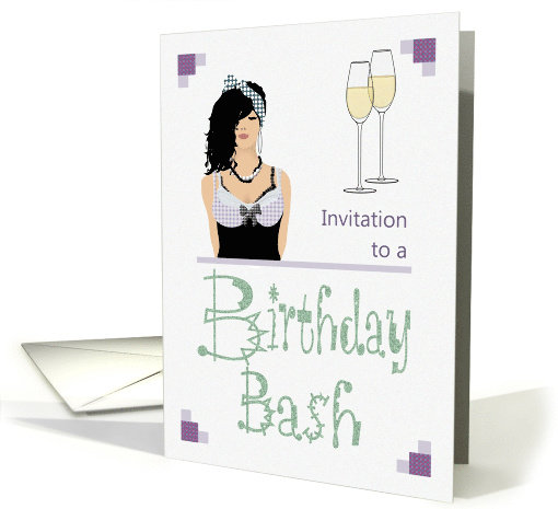 An invitation to a birthday bash. We have a hip looking young lady wearing a bustier, her hair partially piled up with a head band. In the top right corner are two glasses of champagne.