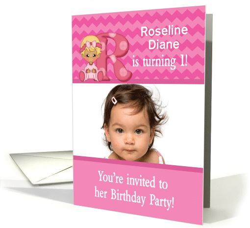| Artist Notes: | An adorable Baby Girl Photo Card Birthday Party Invitation for a one year old that features pink, a zig zag background, a baby girl and the letter "R". Customize with a photo of the child, her name and inside the card, the party information. Design ©2013 Kreative Sentiments Cards by Sherry Harris |