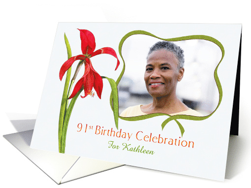 | Title: | Lovely Red Lily 91st Birthday Party Invitation, Custom Photo and Name |