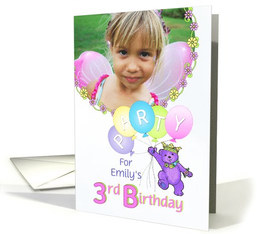 3rd birthday party custom photo invitation featuring a cuddly and cute purple teddy bear princess dressed up in a lovely yellow jeweled crown and pink, blue and green flower accessories holding a bunch of balloons with the word PARTY on them. Personalizing with child's name makes it extra special.