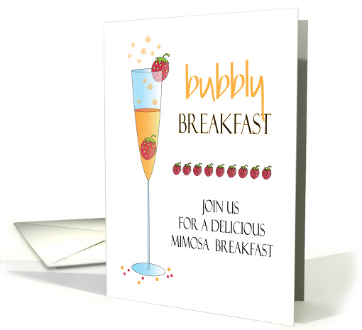 Invite your friends and family to your upcoming Breakfast Get-together with this lovely hand lettered "Bubbly Breakfast" invitation. If you are planning to accent your meal with mimosas of champagne and orange juice, this invitation will get all who receive it anxious to arrive at your party. A long, tall mimosa glass, filled with bubbly and a red dotted strawberry highlights the invitation's left side. The right side contains the elegant hand lettered wording of "Bubbly Breakfast - Join us for a delicious Mimosa Breakfast"." A row a tiny strawberries accent the wording of the card. Complete your breakfast details inside, as you order your invitations, online.