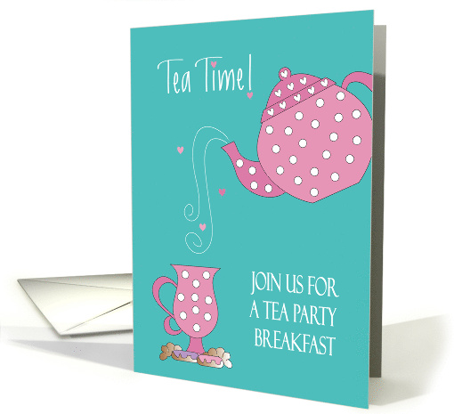 This brilliantly colored teal, with pink, "Tea Time!" invitation will be the ideal way to get all the invitees to your Tea Party Breakfast excited about your upcoming party. A large pink tea pot, with white polka dots, pours white swirls of hearts and tea across the card into the polka dot cup on the lower left side. The card's wording "Tea Time! - Join us for a Tea Party Breakfast!" highlights the tea cup and its pastries, which include donuts and croissants. You can complete all of your tea party details online inside the invitation, as you order them.