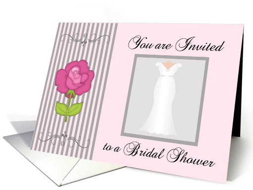 Trendy Bridal Shower Invitation that features pink & grey pinstripes, a pink background, Rose and a Wedding Dress. ©2013 Kreative Sentiments Cards by Sherry Harris