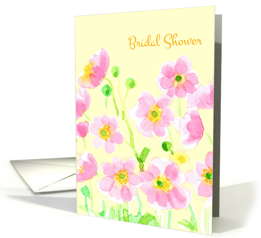 A soft and pretty floral bridal shower invitation decorated with pink anemone flowers painted with watercolor on a buttery yellow background. Lovely for the bride to be! Anemones are a favorite flower for weddings representing anticipation, joy, and light-heartedness.