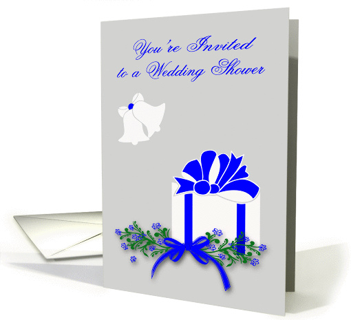 Invitations for your guests to a wedding shower with a card featuring a gift, flower design and bells with a pretty grayish blue background.