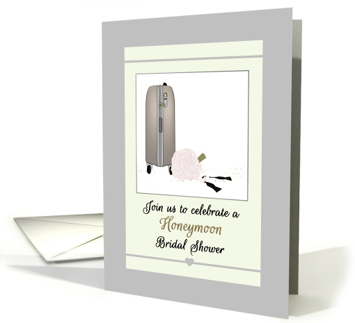 An invitation to a honeymoon bridal shower. This design features a suitcase beside a bridal bouquet of pink roses and a groom's black bow tie on the floor. Beside the bow tie are a couple of rose petals. Colorful confetti are scattered about. The image is set within a white frame which in turn is placed on a soft green frame. The background is colored in grey.
