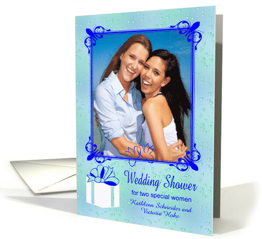 Invite your guests to a lesbian wedding shower honoring two special women with a custom name photo card featuring a blue, fancy frame for a photo of the women and a text box for their names or whatever you choose, it's up to you. Background is blue with hearts, doves and a present. Inside like all GCU cards can be personalized by you if you wish.