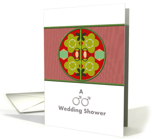 An abstract floral locket in red, green and blue. Two male gender symbols form part of the wedding shower message.