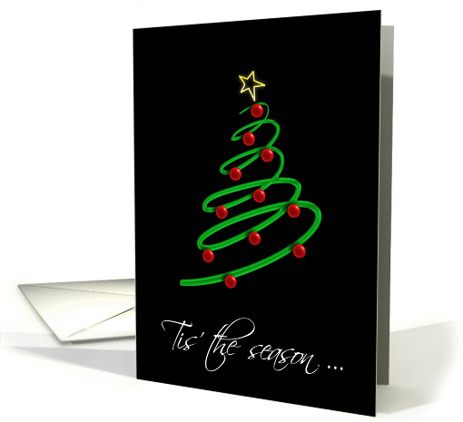 Simple graphic Christmas tree adorns this holiday party invitation. The card features a spiral Evergreen tree with red bulbs and yellow star. Slight glow around the tree topper star. Tis' the Season in white along bottom edge.