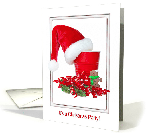 Santa hat on red party cup and festive ribbons with gingerbread man for Christmas party invitation.