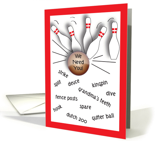 This is an invitation to join a bowling team, featuring my digital design of a bowling ball hitting 5 bowling pins and bowling terms text. You may change the inside message at check out, if you wish.
