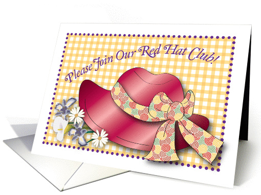 This is an invitation to join a red hat ladies' club, featuring my digital design of a red hat, flowers and yellow checkered background. You may change the inside message at check out, if you wish.