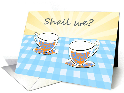 | Artist Notes: | A retro illustration of two cups and saucers, in blue and orange, with a cut out effect.they are standing on a blue and white tablecloth. There is a rising sun rays effect behind in yellow. "Shall we?" is written at the top.Inside is written"lets do coffee and catch up". |