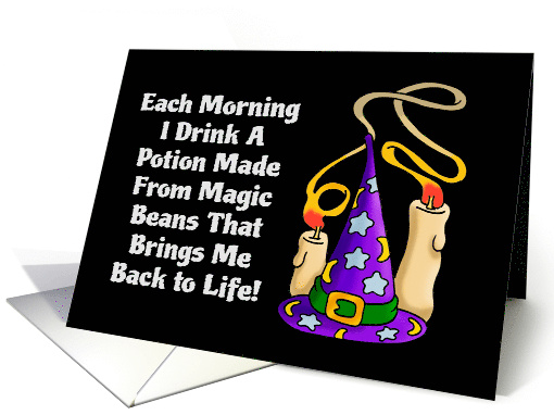 | Artist Notes: | Humorous Let's Do Coffee Invitation card with a drawing of a wizard's hat and two burning candles. The words say, Each morning I drink a potion made from magic beans that brings me back to life! Inside says, Coffee! So join us for some of the delicious brew! |