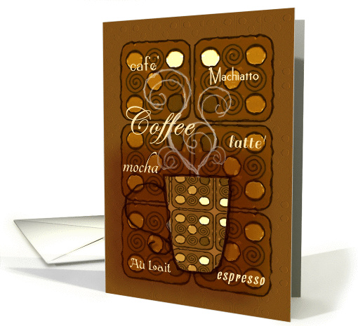 | Artist Notes: | Send this invitation to do coffee with this fun design of a steaming cup of coffee with seven different ways to prepare coffee.Original digital art design by Betsy Bush for Dragonfire Graphics. |