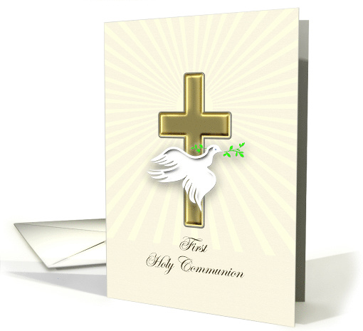 Artist Notes: | Invite friends and family to a first holy communion. This beautiful card shows a golden cross with a dove of peace holding and olive branch. |