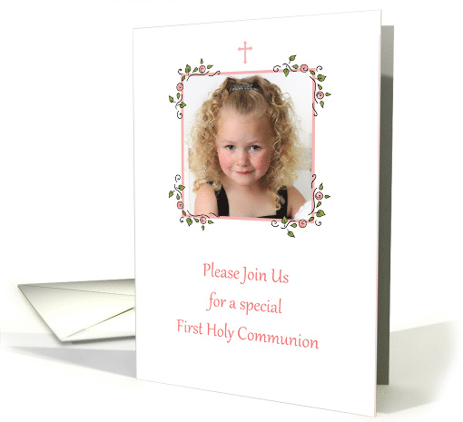 | Title: | Pink Floral Corners, First Holy Communion Photo Card Invitation |