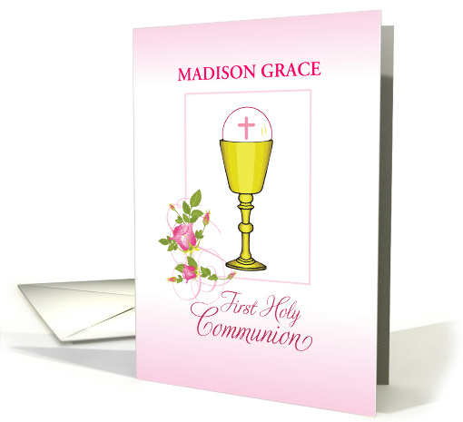 | Artist Notes: | Invite family and friends as she makes her First Holy Communion with this pink card, showing the chalice and host. Roses grace the front of this sweet invitation. Customize the front with her name for a truly personal and sweet Communion invitation. |