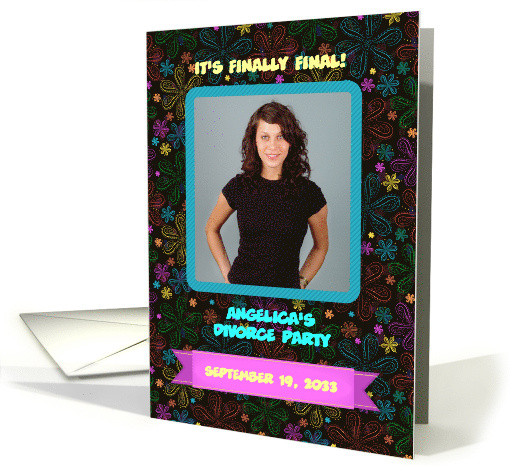| Artist Notes: | Divorce is final party invitation. Bright colorful geometric botanical decor and black background. Blue frame for custom picture. Two places for first and second custom texts. Pink banner for third custom text. |