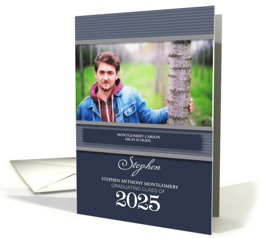 | Artist Notes: | This masculine blue and gray pinstriped graduation ceremony invitations is ready for you to add your grad's photo and customize the front with his or hers details, making this a nice choice to invite friends and family to your son's graduation ceremony. |