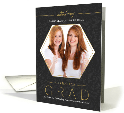 | Artist Notes: | Whether twin girls or twin boys, this elegant commencement ceremony invitation with a damask pattern on charcoal with gold accents will look fantastic with you kid's photo and a winner to invite friends and family to witness their graduation. |