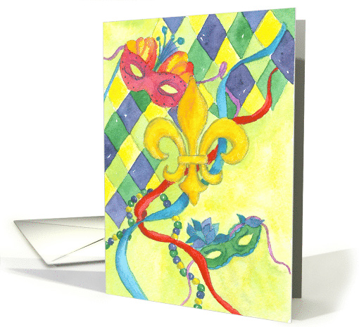 A Mardi Gras party invitation decorated colorful themes of the holiday with a golden yellow fleur de Lis, ribbons, beads, masks, and diamond patterns over a bright yellow watercolor wash background.