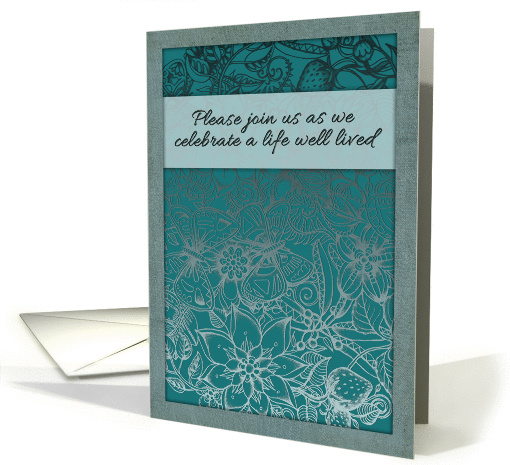 | Artist Notes: | An intricate, detailed, hand drawn illustration of flowers, leaves, berries & butterflies decorates the dark teal background of this funeral / memorial service invitation. Text on a banner reads: Please join us as we celebrate a life well lived. Colors: teal, silver-grey (non-metallic), blue. |