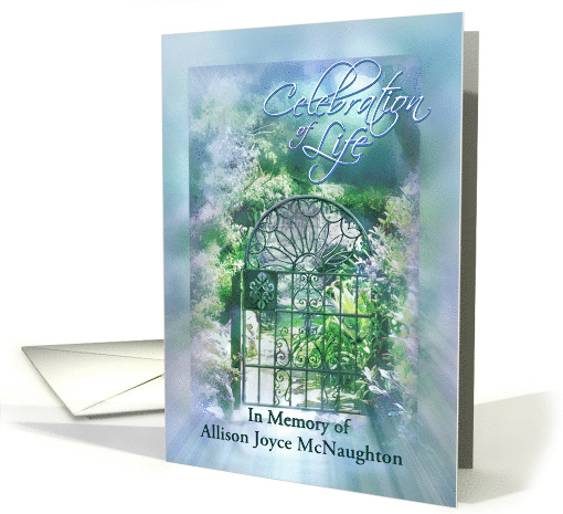 | Artist Notes: | Your loved one has left you many beautiful memories. Now it's time to remember and to celebrate the life of one who has passed. This Celebration of Life Memorial Service invitation features a lovely garden gate with soft sun rays and the hint of a beautiful garden beyond. Add your loved one's name to the front of this invitation for a Celebration of Life, for a personal touch. |