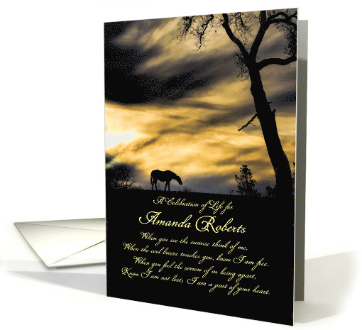 | Artist Notes: | A beautiful spiritual celebration of life or memorial service card that you can customize with a name. A beautiful poem, horse in the sunrise, this is more than an invitation, it is a keepsake tribute card. |