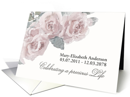 You can customize this invitation for a Celebration of Life by inserting the name and dates of the beloved person who passed away into the placeholder. All text inside the card can also be changed to suit your requirements. Peaceful pale watercolor roses paired with elegant script font.