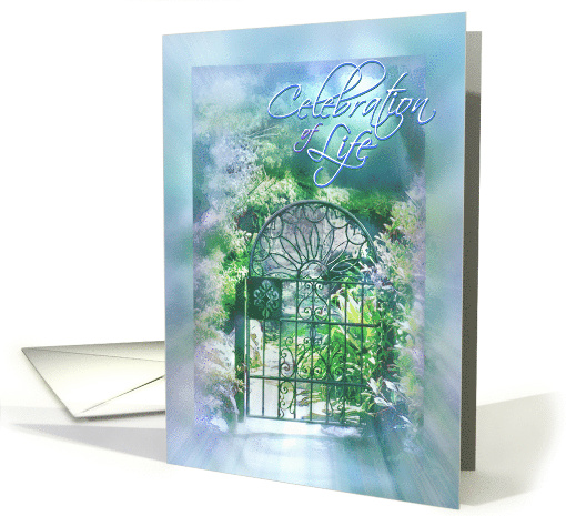 You have lost someone you dearly loved, and with that grief comes memories of a life well-lived. Remember and celebrate the life of the one who has passed with this Celebration of Life Memorial Service invitation. The cover features a lovely garden gate with soft sun rays and the hint of a beautiful garden beyond. You may add a jpg. photograph of the deceased to the inside cover of this Memorial Service Invitation.