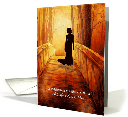 This Golden Bridge Celebration of Life Invitation has is done in rich gold hues featuring a woman silhouette as she gazes toward the light.