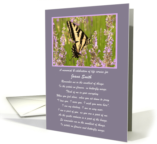 Artist Notes: | A way to let folks know of the passing of a beloved soul and to join in a memorial or celebration of life service. Customize the name on this card of loving remembrance. |