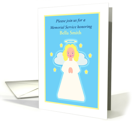 A customizable invitation to a memorial service for a deceased child featuring an adorable praying, blonde haired angel with heart wings and glowing halo and glowing stars. Front can be personalized with child's name. This original angel design by artist c.a.teresa is available with different skin and hair colors and can be custom ordered in different color combinations to suit your needs. Inside can be personalized with photo and name or your own verse. Contact me for help and your custom request can generally be ready in 24hrs. or less!