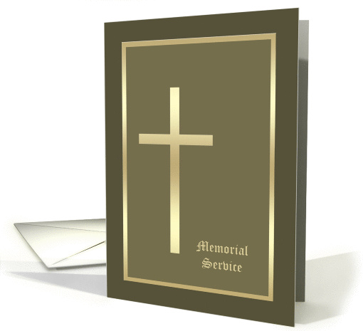 | Artist Notes: | This stunning memorial service invitation features a golden cross on the front on an olive green background. The words Memorial Service appear to the right of the cross. |