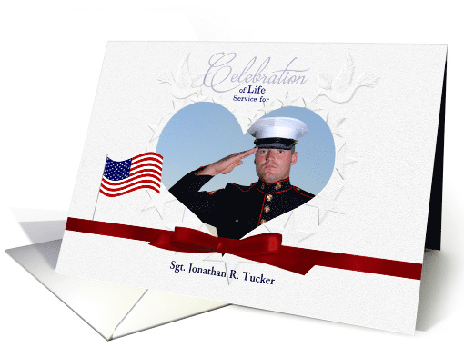 | Artist Notes: | Two doves hold a heart where you insert the military or civil servant's photo in this patriotic and powerful Celebration of Life Service Invitation. Though our invitation has an Embossed-like look there is no indication of embossing to the touch. |