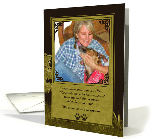 | Artist Notes: | Very masculine color palette in soft to dark green hues, with two dog paw prints and a grassy foreground overlay on this Memorial Service Invitation with photo and custom text for the animal lover, rescue volunteer or veterinarian. |