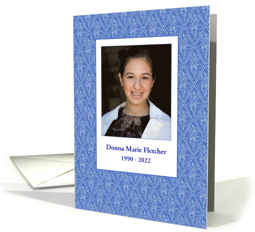 | Artist Notes: | An invitation card for a funeral or memorial service that you can customize with a photo as well as the name on the front and details of the service inside. The photo is surrounded by a white border, which in turn, is on a bright blue pattern of periwinkle flowers. The periwinkle pattern originated from the periwinkles in my little garden that flower all through the winter, providing cheer, even in the darkest of days. |