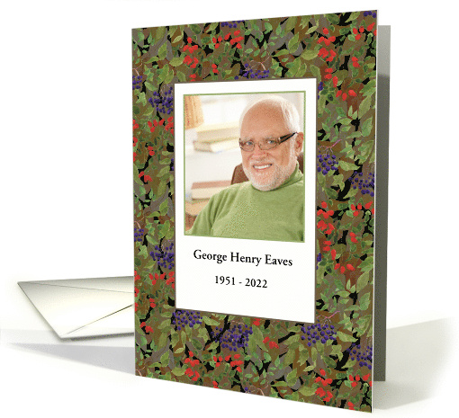 Artist Notes: | An invitation card for a funeral or memorial service that you can customize with a photo as well as the name on the front and details of the service inside. The photo is surrounded by an ecru border, which in turn, is on a richly coloured pattern of fall hedgerow fruits, originally painted in water colour. This design is suitable for either sex. |