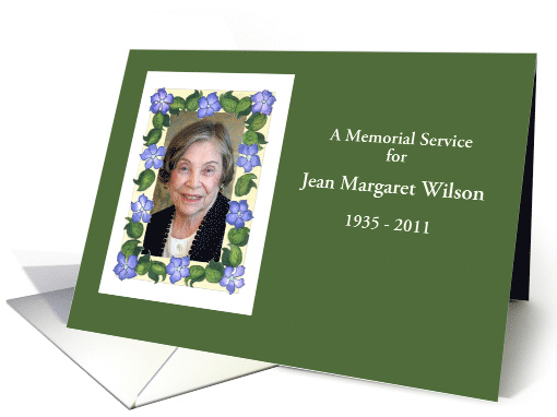 Artist Notes: | A customisable Memorial Service or Funeral Photo Card Invitation, with a border of blue periwinkles and a soft sage green background, from a handpainted design by Judy Adamson. |