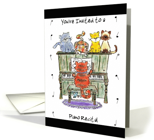 | Artist Notes: | ©Christie Black. In this musical note bordered illustration, a cat plays an upright piano while a little blue mouse controls the pedals. A group of cats sit upon the top of the piano listening to the music in this Piano Recital Invitation. |