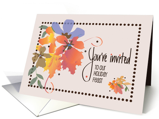 | Artist Notes: | If you are planning a Thanksgiving feast this year and want to invite friends and family to your get together, why not send out this special holiday feast invitation to invite all to your delicious gathering? A cluster of colorful gold, orange, brown and green leaves are gathered in the invitation's top left corner, opposite the rich chocolate brown hand lettering of "You're Invited" - "To a Holiday Feast" that fills the opposite diagonal corner of the light beige invitation. Repeating dots of deep brown accent all edges of the card, with details inside to be completed online, as they are ordered. |