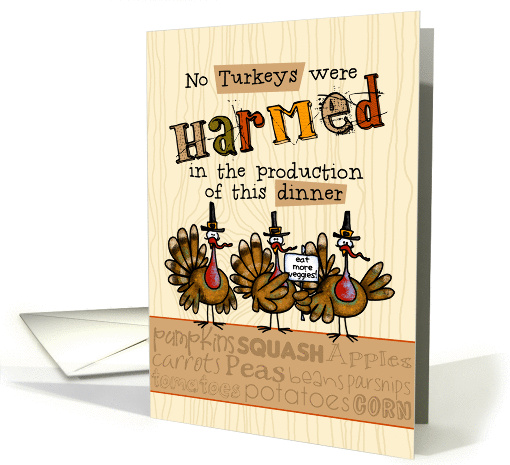 Artist Notes: | Three turkey pilgrims holding a sign saying "eat more veggies" stand on top of a "subway art" inspired banner in autumn colors with a Thanksgiving feast mini word cloud on a light woodgrain background. A playful and trendy Vegetarian or Vegan Thanksgiving dinner invitation |