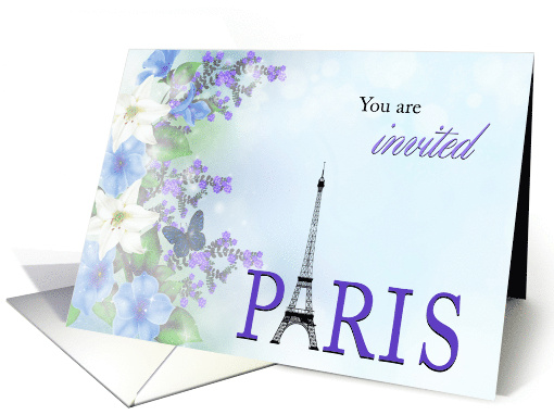 | Title: | Invitation to Paris with Eiffel Tower and Purple Flowers |