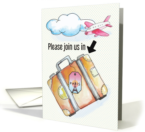 | Artist Notes: | Send fun and colorful invitations for a getaway in Paris with this design featuring a suitcase with a tag to Paris, the Eiffel Tower, an airplane, and a cloud. |