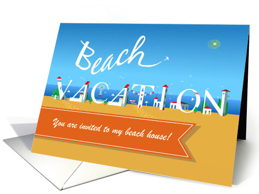 | Artist Notes: | Beach Vacation Invitation Card. Custom text front. Beach - white text with plane in the sky. Vacation - letters are as white houses with red roofs and trees. Blue and yellow background - sea with lighthouse, ships and boats. Orange banner for custom text. You are invited to my beach house! |