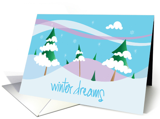 If you own a mountain home, cottage or cabin and you would like an special beautiful invitation to invite friends and family to come and visit you and spend time in the beautiful mountains and snow surrounding your mountain home, this fun invitation is the perfect way to invite these special people. Three snow covered pine trees stand at the center of a beautiful mountain vista, with soft, white snowflakes falling from above. The wording on the card is hand lettered, in blue, and says "Winter Dreams". The inside has an area for you to complete the names of those invited, your name as the Host or Hostess and location details, during ordering.
