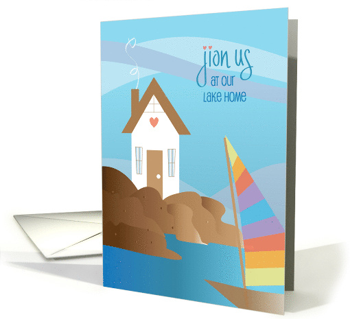 "Join Us at Our Lake Home" is the dark turquoise hand lettered wording on this invitation, that all will love receiving from you, as you invite them to accompany you to a vacation along the lake, in your lake house. The card's house is white and sits along a rocky shore, by the water's edge. Passing by, in the lower right hand corner, is a beautifully colored and striped sailboat. The inside wording of the card says "We hope you can join us for a fun vacation we are planning to our lake house!"